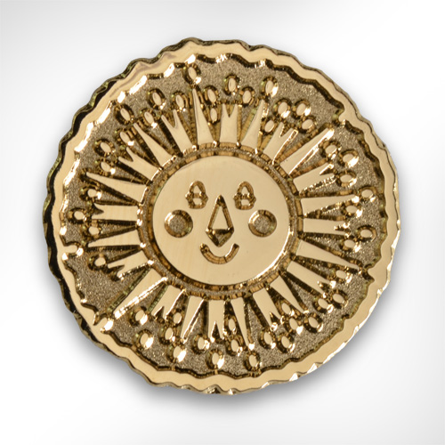 また、バッジはあえて色入れはせず、太陽がテーマになっているということで金メッキ仕上げを選択。デザイン自体は凹凸のみで表現しています。後光や中心の線画部分が描き込まれた細かなデザインながらも、しっかりと凹凸をつけたことで、凹部分の梨地と、凸部分の鏡面との光の加減がとても印象的な作品となりました。後光部分は、まさに燦々と太陽が降り注いでいるようですね。バッジ裏の付属品には、タイタックをお選びいただきました。タイタックは針を差し込むタイプで、洋服はもちろん、キャップやバッグなどにも簡単に装着でき、汎用性のある留め具となっています。