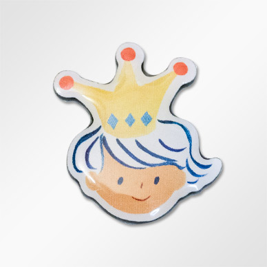 バッジでは、その雰囲気とタッチが表現できるように、濃淡や色味を忠実に反映する印刷バッジをお勧めしました。外形はあえて、王冠の形や顔、髪の毛の輪郭をかたどって切り抜き、淡いタッチという持ち味が際立つ仕上がりを目指しています。バッジの裏付属品には、取り外ししやすい蝶タックを選択。留め具自体の厚みもないので普段着やキャップなどに気軽に装着できます。また裏面には、王さまの名前それぞれをレーザー彫刻しているので、りんご王国を思い出すツールとしても役立ちそうですね。